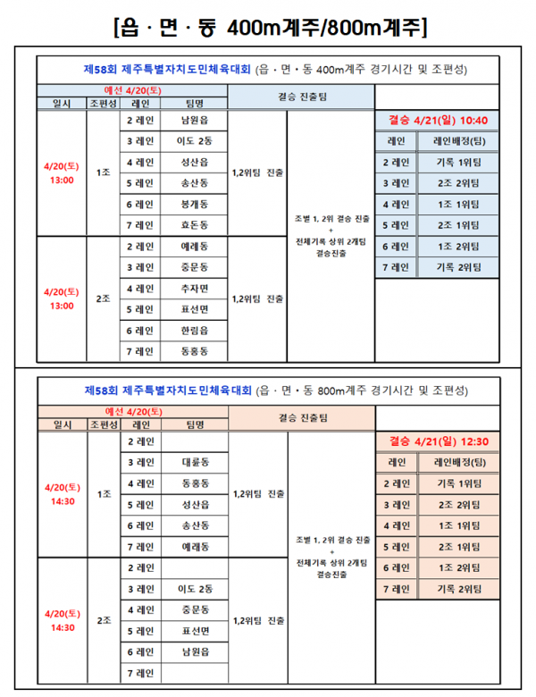 제목 제58회 도민체육대회 읍면동 400m계주, 800m계주 조편성 및 경기일정표